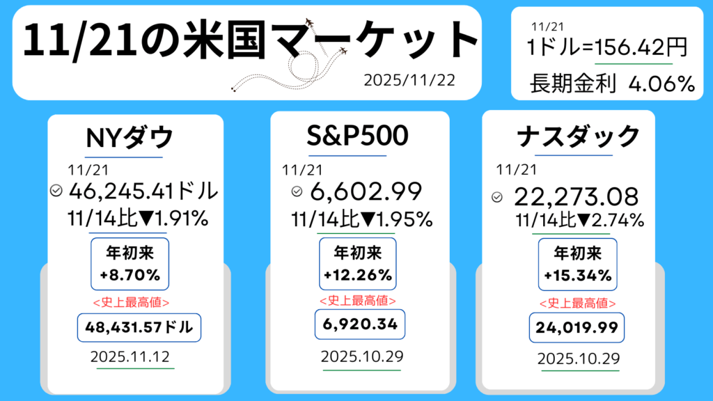 週初はFRB高官の慎重な発言を受けて利下げの先送り懸念が強まり、主要株価指数は続落。特に19日のエヌビディア決算を前に、AI関連や大型テック株でポジション調整の売りが広がりました。